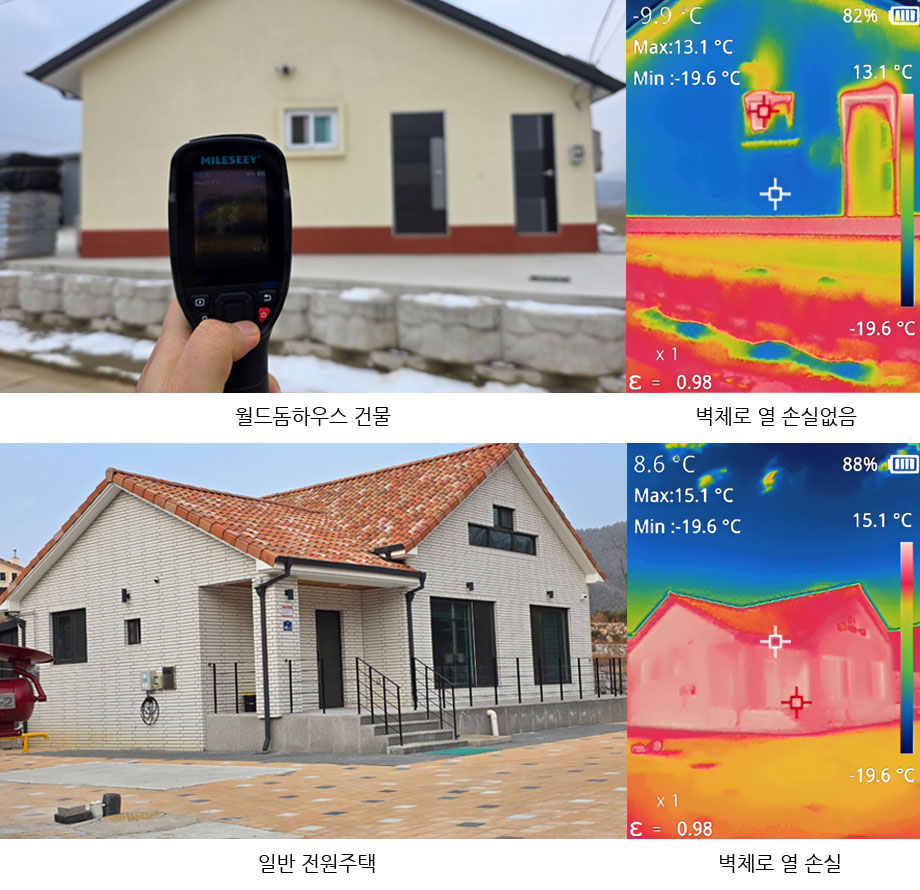 아무리 좋은 단열성능을 가진 건축자재도 전체 건물 연결부의 기밀성이 없으면 난방열이 모두 틈새로 빠져나가지만 월드돔하우스는 건물벽체 단열과 기밀성능을 동시에 잡았음.
