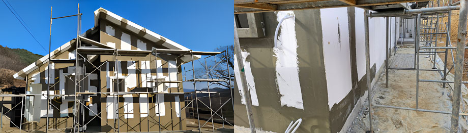 기초부터 지붕까지 건물 전체를 철근역할을 하는 강화섬유와 시멘트,시멘트 본드를 교반하여 결합하는 압착미장공법으로 모든 건물이 서로 견고하게 고정되는 일체화 특허공법