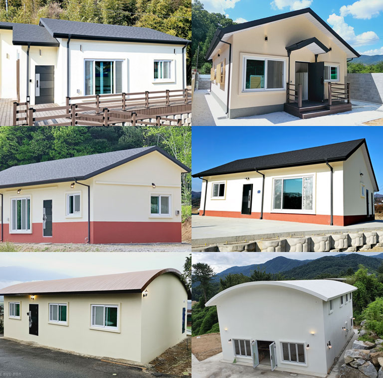 - 직각형은 경량철골조의 처마있는 타입으로 고압축eps단열 벽체에 미장마감을 하는 건축타입으로 일반주택과 동일한 외관 제공